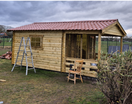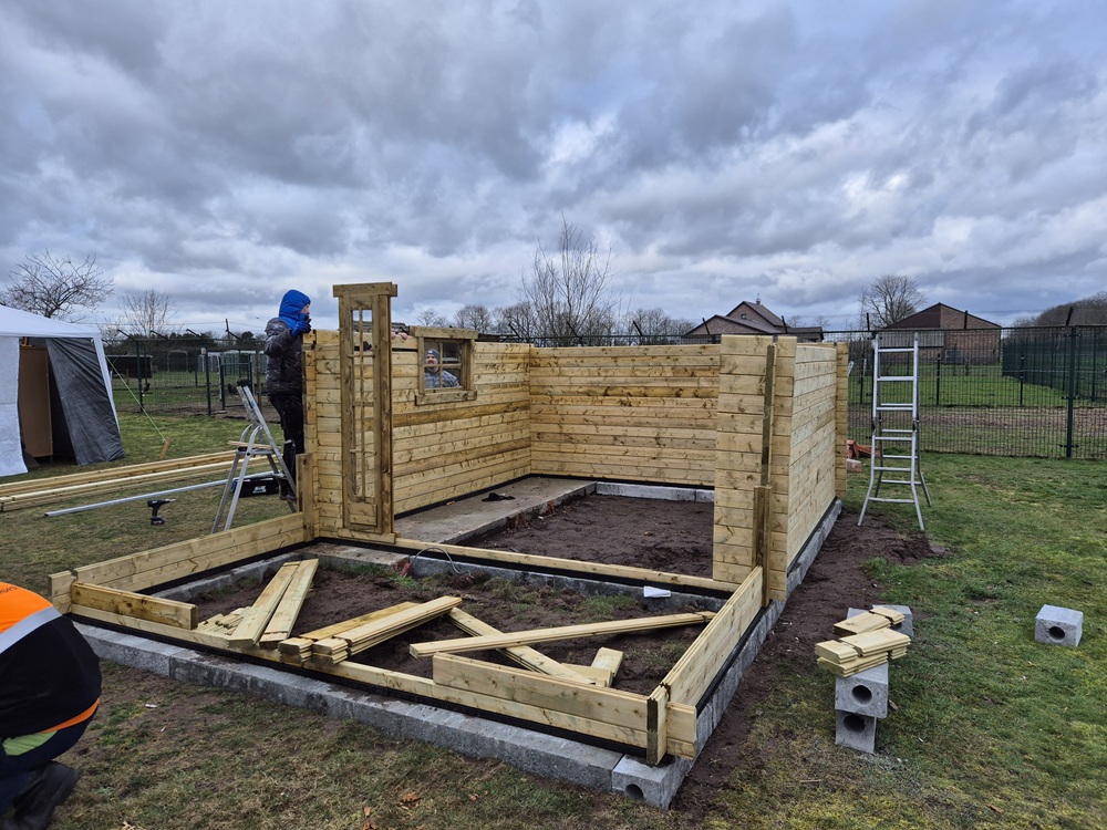 Na twee dagen hard doorwerken met een ploeg gedreven vrijwilligers staat de nieuwe chalet “Whoopy’s” onder dak. Vandaag wordt de vloer erin gelegd en wordt ook al gestart met de afwerking aan de binnenzijde met isolatieplaten en plastic schroten.