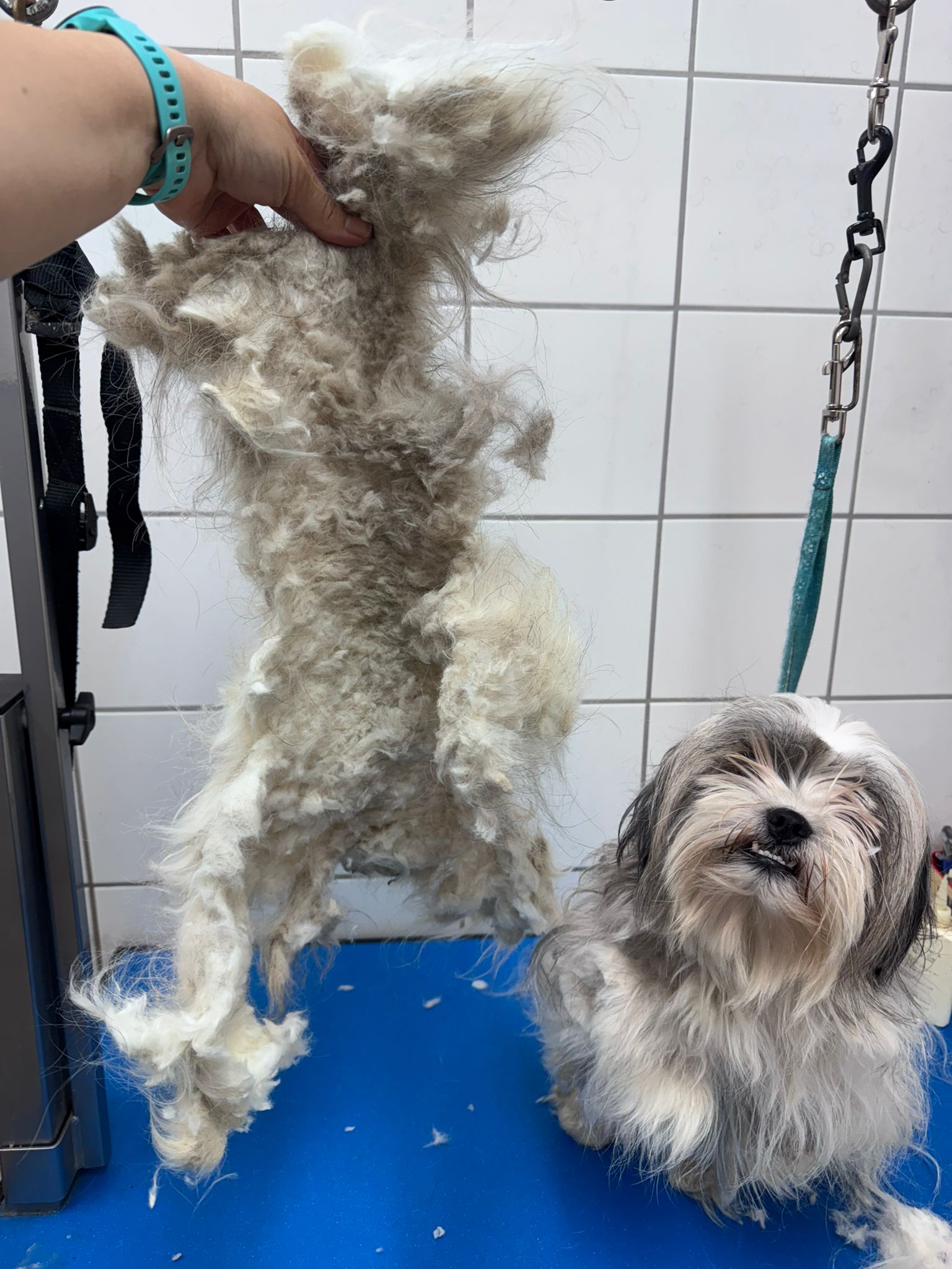 Deze speelse lieverd had haar puppyvacht nog onder de dikke klitten. Daarom werd ze dadelijk bij aankomst door de kapster een stuk lichter gemaakt en daar had ze zeker genot van.