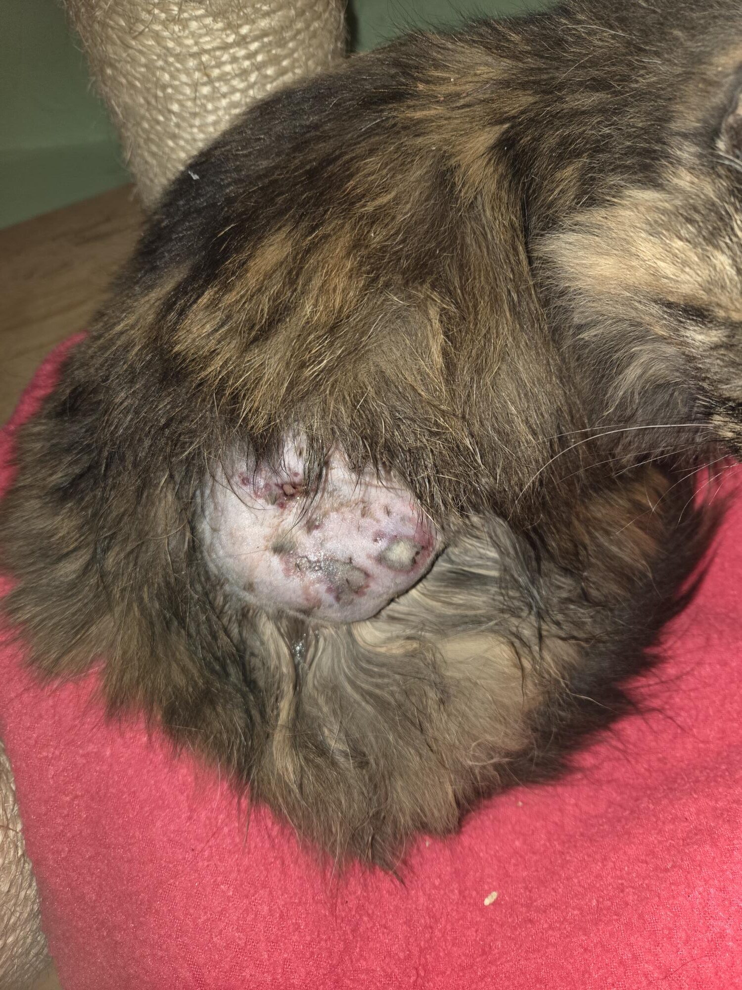Dream werd op vrijdag 12 december binnen gebracht nadat ze via een zwerfkattencampagne van straat werd gehaald met ernstige wonden. De sukkel is gebeten door “iets” wat een hond kan zijn maar zekerheid is er niet. Wat wel zeker is, is dat ze al een tijdje met dit probleem rondliep maar dat het door haar lange vacht niet direct was opgevallen bij de mensen die haar van eten voorzagen. Echter toen ze mankte riepen ze de hulp in van de plaatselijke zwerfkattencampagne wat haar geluk is geweest.