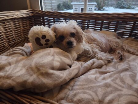 Ondertussen is Dutske een tweetal weken bij ons en is ze open gebloeid tot een speels hondje dat maar al te graag met pieppopjes speelt. Wat een verschil met het ongelukkige hondje bij aankomst waarin amper leven zat.