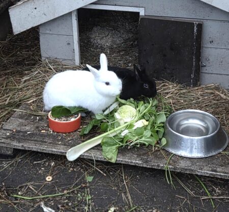 Deze twee konijntjes zijn zusjes, geboren in juni 2024 en beiden gesteriliseerd. Ze werden afgestaan omdat de kinderen er niet meer naar omkeken… het typische verhaal. Ooit gekocht bij Horta…, uiteraard zonder enige kennis van konijnen. De diertjes waren niet gesteriliseerd en zaten veel te klein waardoor ze mekaar de haren uittrokken… letterlijk. We lieten ze dadelijk steriliseren en reeds twee dagen later zaten ze gemoedelijk naast mekaar te eten zonder enig greintje van venijn.