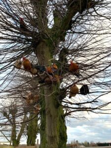 Al onze gevederde vrienden hebben grote stallen met legnesten ter beschikking evenals talloze kleine huisjes. Een groot deel van de hanen leeft in een aparte weide met stallen zodat ook de kippen van een stressvrij leven kunnen genieten. Raar maar waar verkiezen sommigen onder hen om ’s avonds gezellig samen in de boom te slapen. Daar zal je ongetwijfeld een prachtig uitzicht hebben op de mooiste zonsondergangen!
