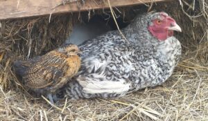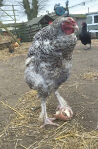We hebben ook een grote groep kippen en hanen die we met veel liefde verzorgen. Vooral van hanen wordt regelmatig afstand gedaan omwille van vechten met mekaar, teveel stress voor de kippen, miskoop (kippen gekocht die toch hanen blijken te zijn), … Er zijn echter ook kippen die bij ons terecht kwamen en amper in staat waren om te stappen zoals de grijs-wit gevederde Viola. Zij werd op 30/1/2026 vanuit een vogelopvangcentrum naar ons gebracht en leed aan toxoplasmose en een ernstige wormbesmetting. Ook zij kreeg een medische behandeling, is inmiddels al wat aangesterkt en kan terug scharrelen naar hartenlust. Haar dutjes doet deze reuzin van onze kippenfamilie samen met één van haar kleinste vriendinnen onder de hooimijt.