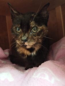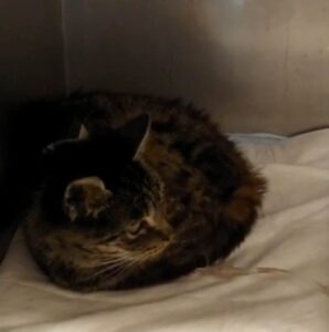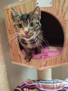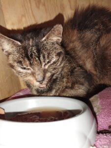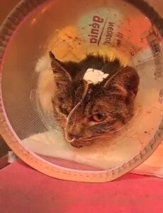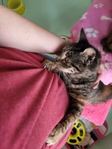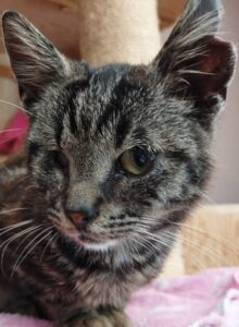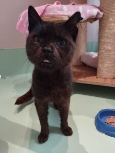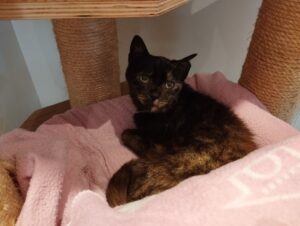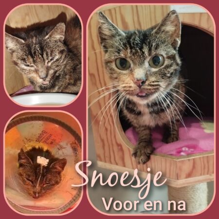 Het zwakste poesje, Snoesje, heeft bovendien tijdelijk een voedingssonde moeten krijgen. Zij kon onmogelijk eten. Zoveel ulceraties onder en op de tong had zelfs de doorwinterde dierenarts nog nooit gezien. Hoeveel pijn moeten deze lieverds wel hebben gehad? En ondanks hun erbarmelijke toestand bleken ze ongelooflijk lief. Alle zes begonnen ze onmiddellijk te spinnen wanneer we ze zachtjes streelden en toespraken bij binnenkomst.